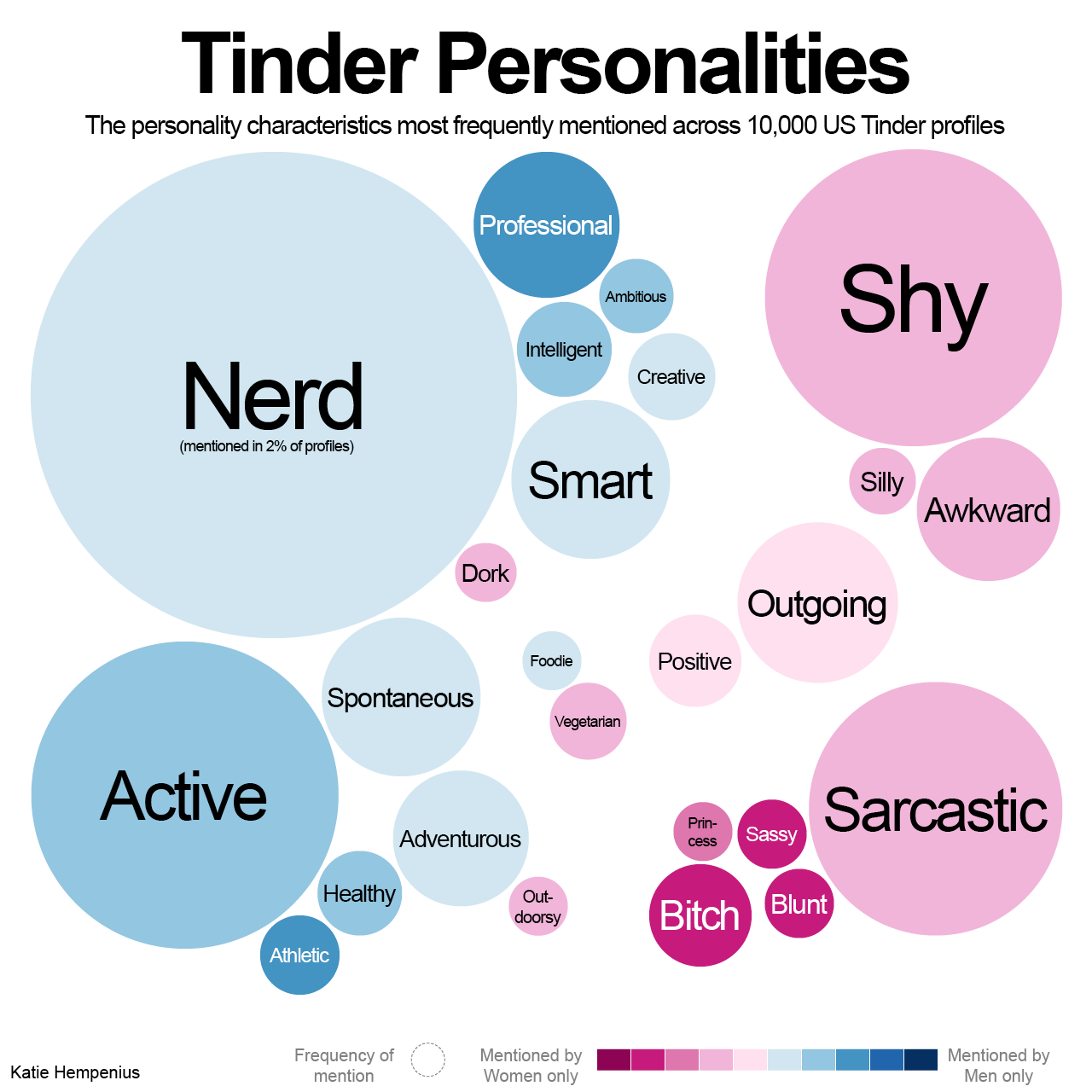 This investigation looks at how people describe their interests, personalities, and physical selves across 10,000 Tinder profiles that were collected via botting.